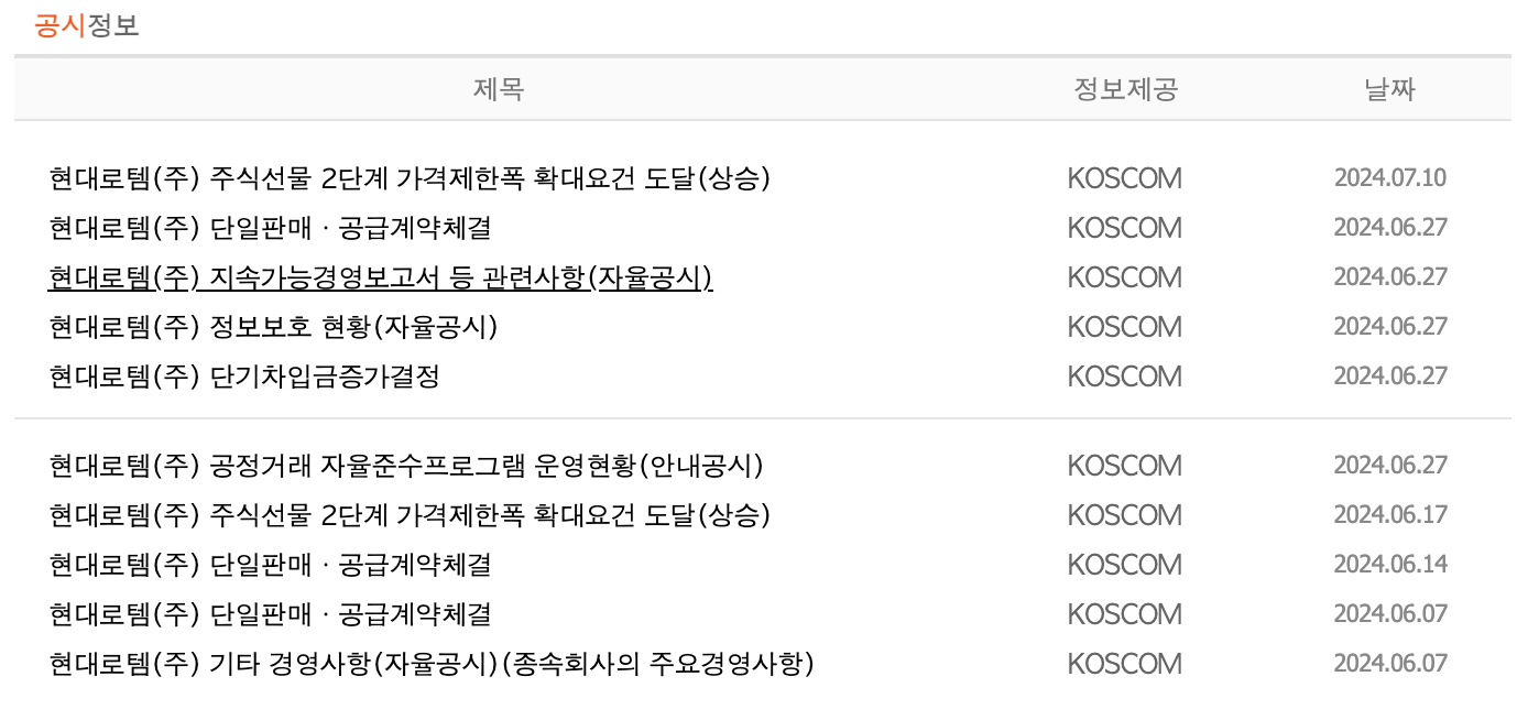 - 2024.07.10: 현대로템(주) 주식선물 2단계 가격제한폭 확대요건 도달(상승)